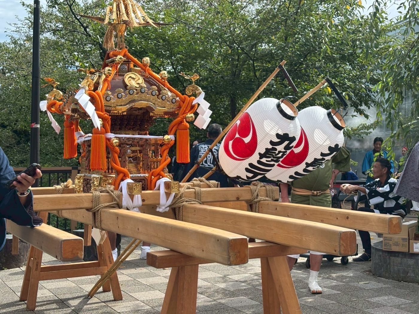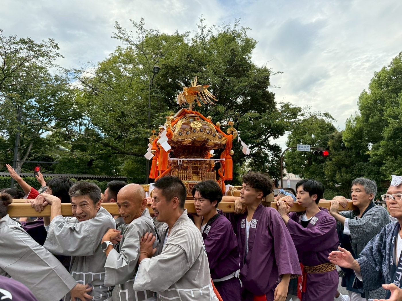 曇り空はだんだんと晴れ間を広げ、神輿渡御が行われ会員は担ぎ手の皆様とともに汗を流しながら神輿を担がせていただきました。