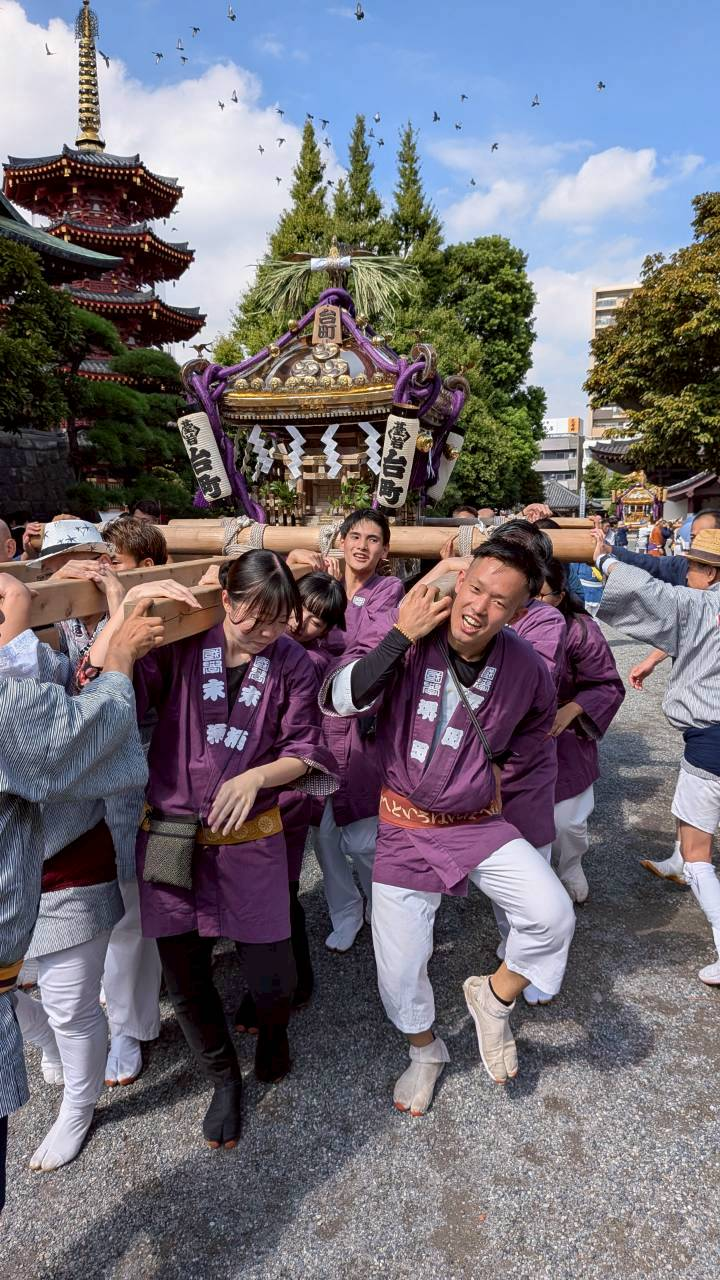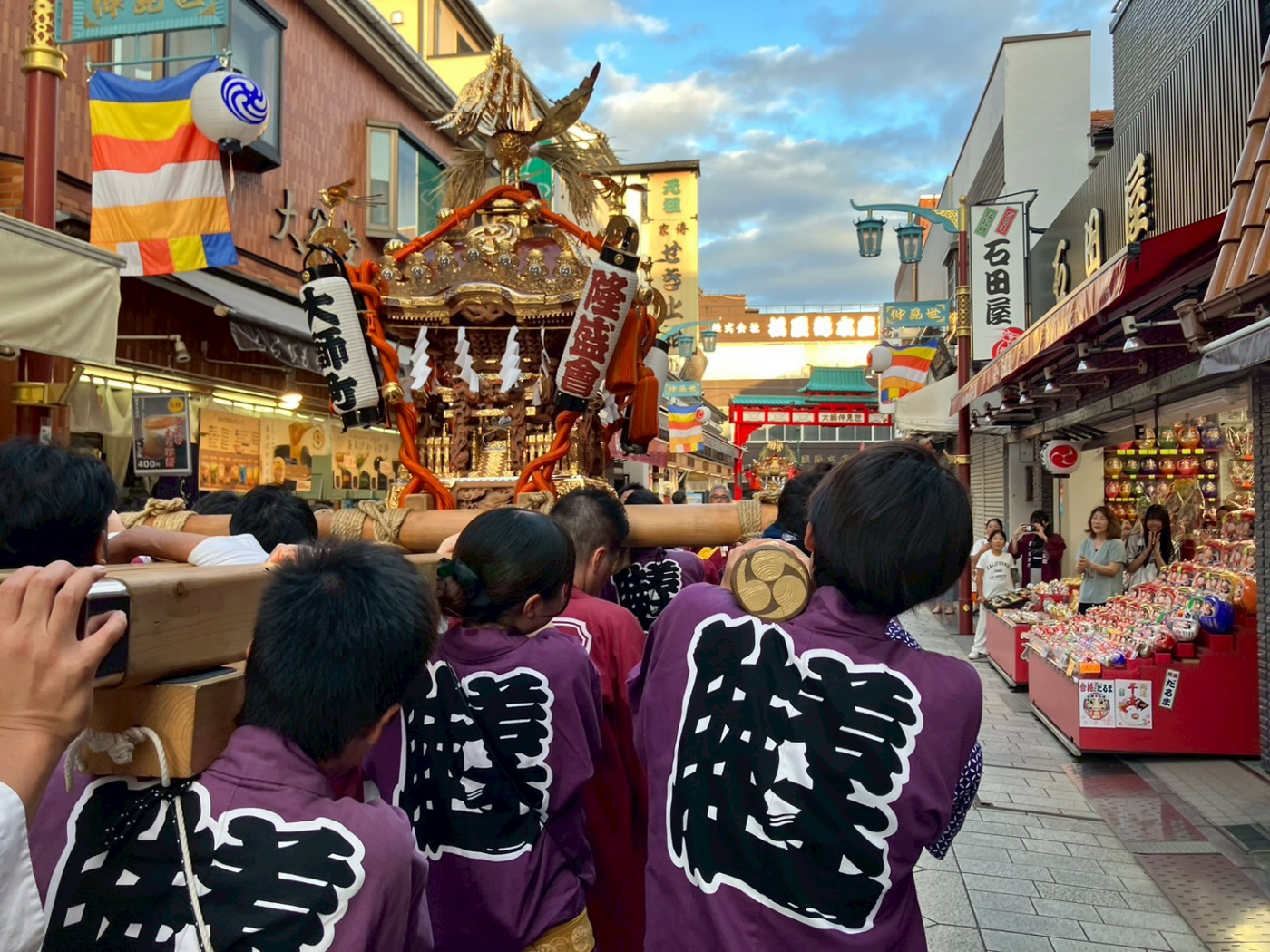 渡御が進むと、神輿はだるま市や厄除けなどで知られる川崎大師の寺中でも担がれました。
