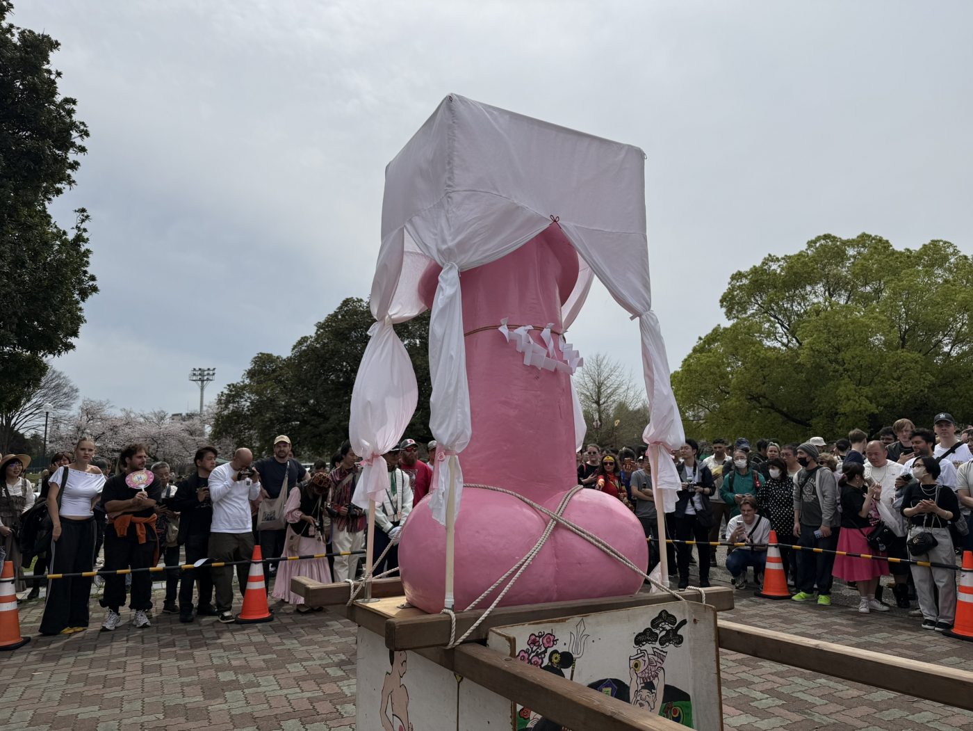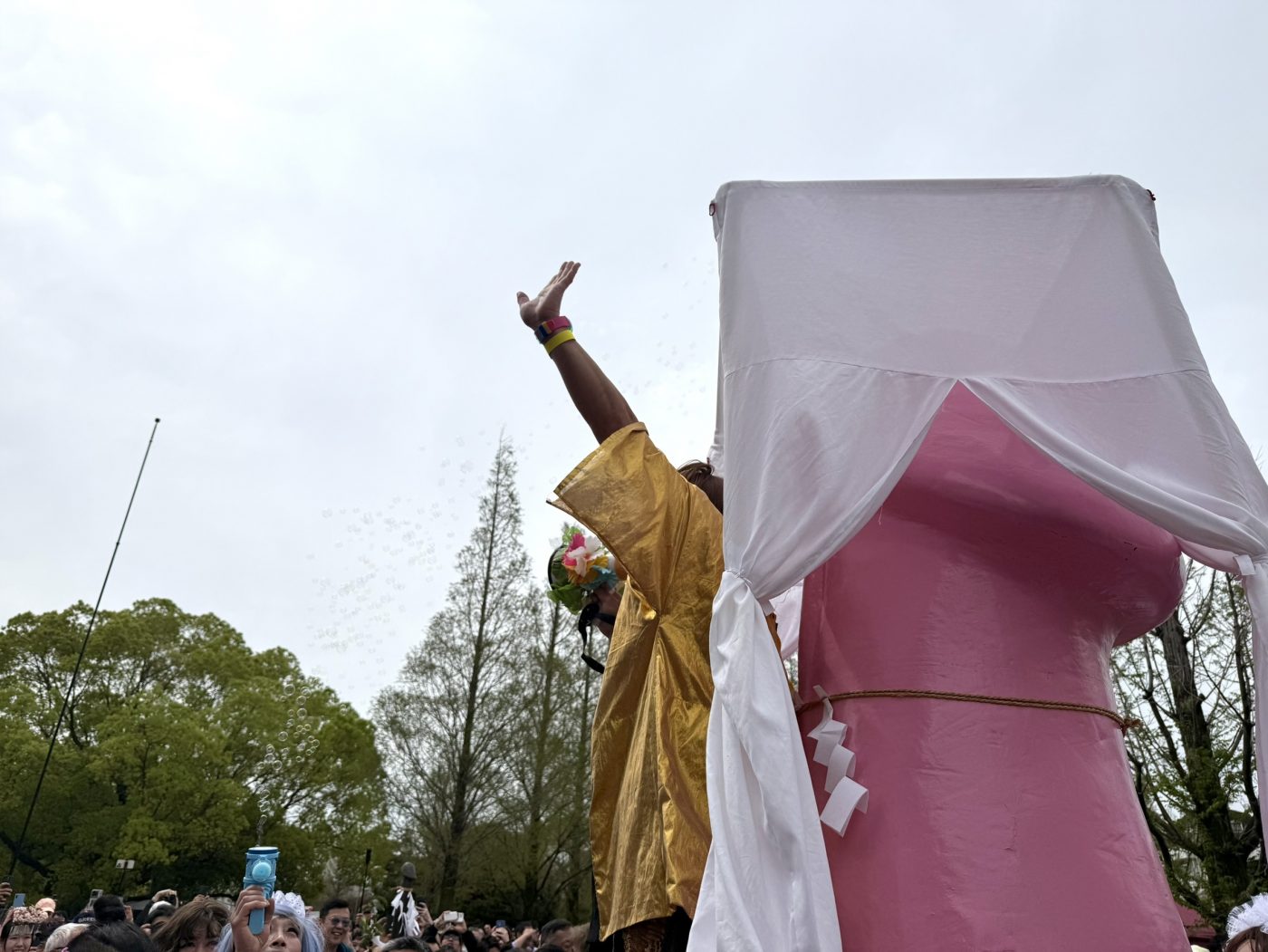 本祭には「かなまら大神輿」「かなまら船神輿」「エリザベス神輿」の3基があり、中でもピンク色の「エリザベス神輿」は担ぎ手に男装・女装が必須とされることで有名です。